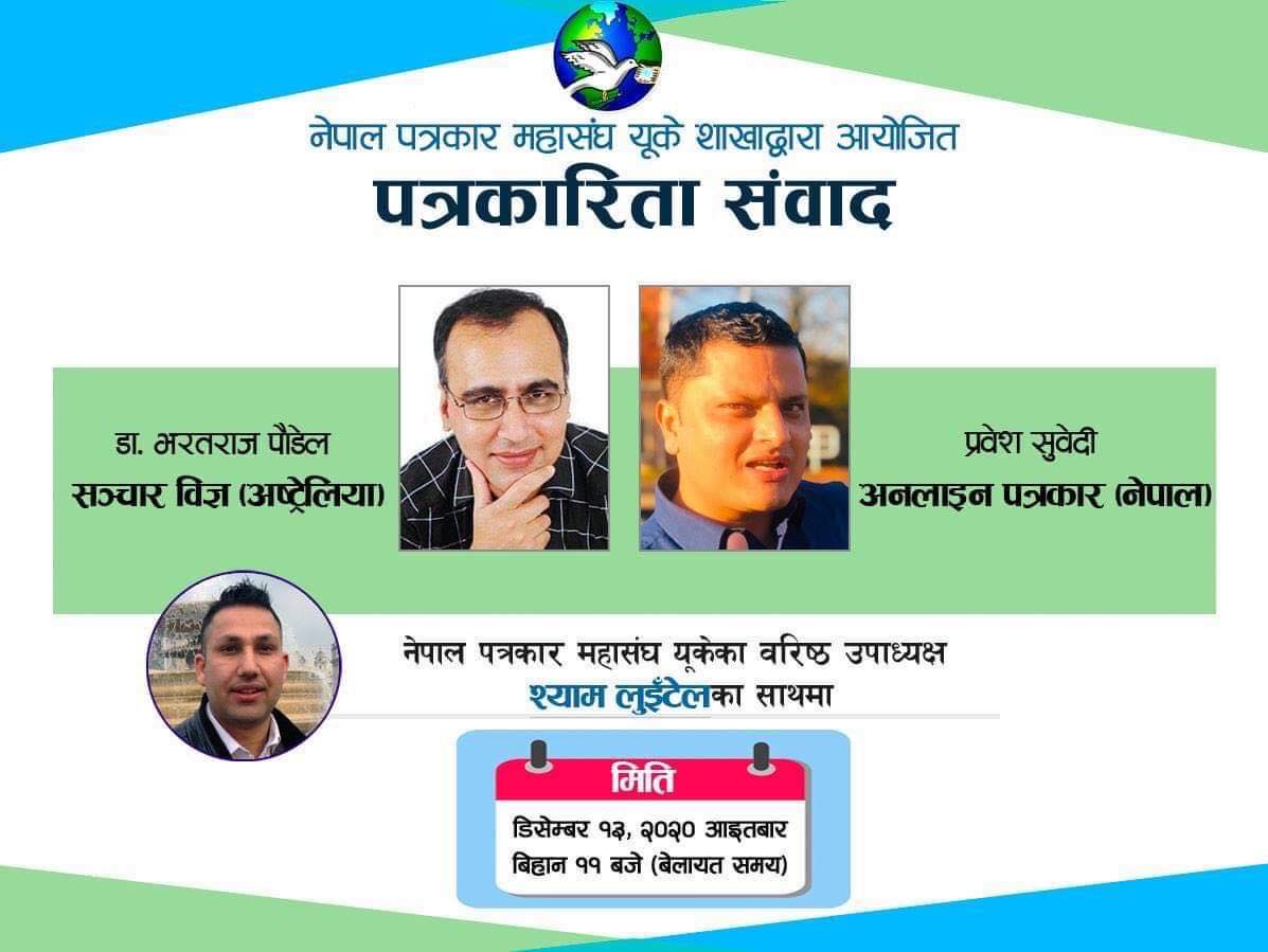 लण्डन । नेपाल पत्रकार महासंघ (एफएनजे) बेलायत शाखाले आगामी आइतबारदेखि शाखाका सदस्यहरुको पत्रकारिता पेशामा क्षमता अभिवृद्धि गर्ने उद्देश्यले ‘पत्रकारिता संवाद’ शुरु गर्न लागेको छ । पत्रकारिता क्षेत्रका विज्ञ र अग्रजहरुसँग अनुभव र ज्ञान आदानप्रदान गरी आफ्ना सदस्यहरुलाई लाभ पुर्याउने उद्देश्यले शाखाले सो संवाद संचालनमा ल्याएको हो । यो संवादको पहिलो अंक आइतबार हुनेछ ।