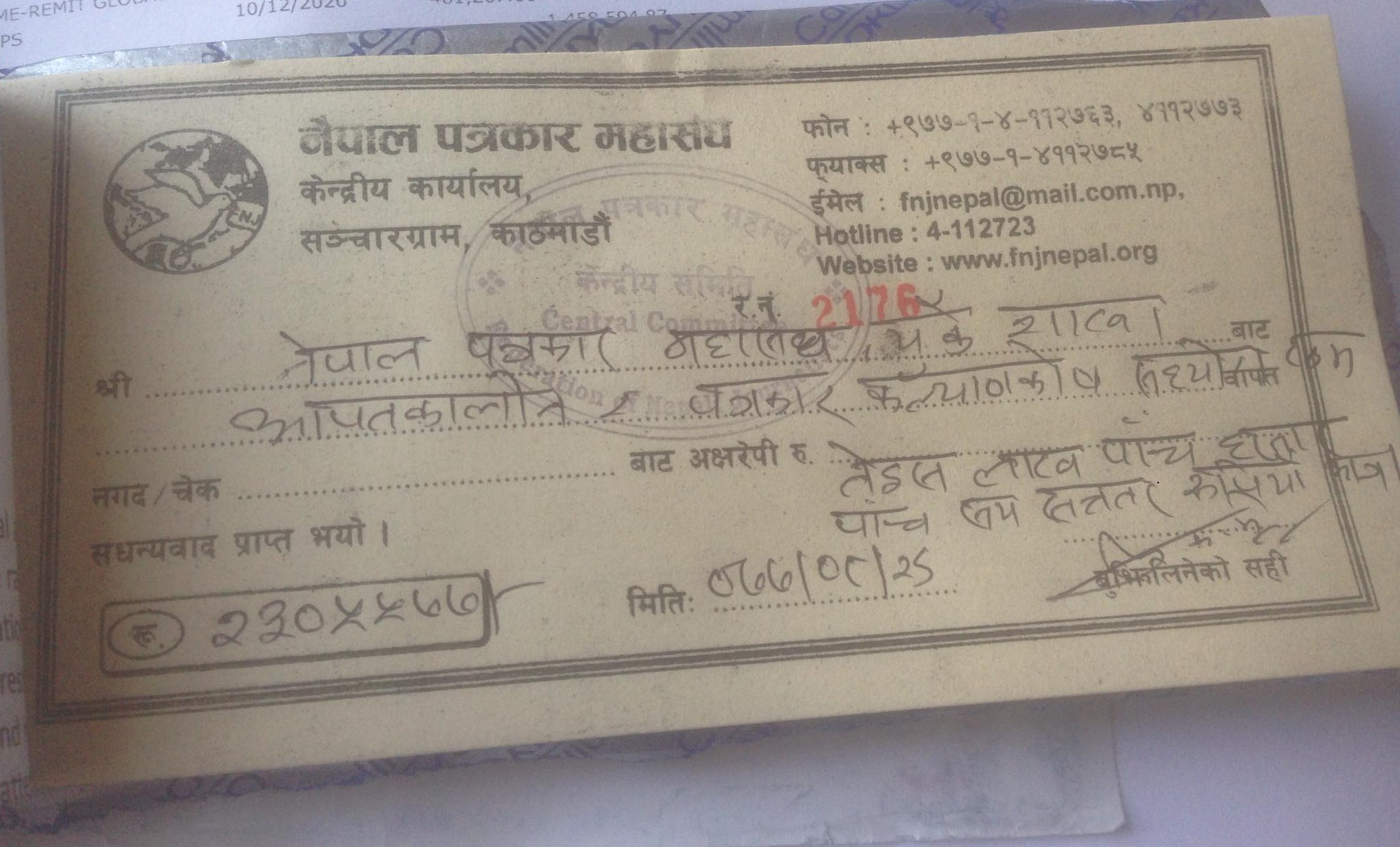शाखाका अध्यक्ष नरेश खपाङ्गीमगरका अनुसार सो राशीमध्ये २० लाख रुपियाँ कल्याण कोषमा जम्मा गर्नका लागि र बाँकी रकम कोरोना प्रभावित नेपाली पत्रकारहरुलाई तत्काल प्रदान गर्नका लागि केन्द्रलाई अनुरोध गरिएको छ।