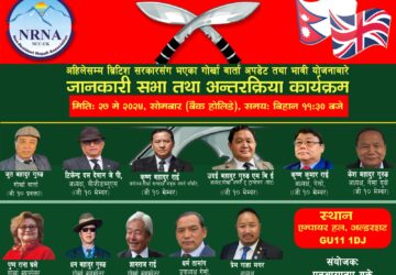 लन्डन । गैरआवासीय नेपाली संघ (एनआरएनए यूके) ले भूतपूर्व गोर्खा र उनीहरुका परिवारको चासोलाई विशेष ध्यान दिँदै विभिन्न गोर्खा संगठन आवद्ध जी टेन समूहका प्रतिनिधि र सर्वसाधारणबीच एक अन्तरक्रिया गर्ने भएको छ । भूतपूर्व गोर्खा समस्या समाधानका लागि बेलायत...