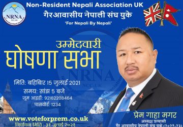 लण्डन । गैर आवासीय नेपाली संघ, यूकेका उपाध्यक्ष प्रेम गाहा मगरले संघको आसन्न अधिवेशनमा अध्यक्ष पदमा उम्मेदवारी दिने भएका छन् । ३१ जुलाईमा हुने एनसीसी यूकेको निर्वाचनमा गाहा मगरले अध्यक्ष पदमा उम्मेदवारी दिने भएका हुन् । जुलाई १५ तारिक बिहीबार...