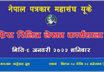 लन्डन । नेपाल पत्रकार महासंघ बेलायत शाखाले बेलायतस्थित नेपाली संघसंस्थाका प्रतिनिधिहरुको लागि प्रेस रिलिज लेखन कार्यशाला चलाउने भएको छ । यही शनिबार जनवरी ८ तारिख शनिबारका दिन भर्चुअल जुम माध्यमबाट कार्यशाला चलाउन लागिएको शाखाका महासचिव नरेन्द्र बस्नेतले...